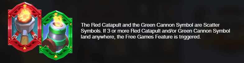 A Viking Clash ingyen pörgetéseit legalább 3 katapult/ágyú pörgetésével indíthatod, ha ez sikerül ezek wild egy-egy véletlenszerű wild szimbólumot repítenek az ellenkező pályára. 6 ingyen körrel indulsz, de minden katapult/agyú szimbólum újabb ingyenes kört és Wild szimbólumot ajándékoz. Ha sikerül felmenni 15 ingyenes körré akkor már egy majdnem teljes tárcsa Wild szimbólum óriási nyereményeket szerez a játékosnak.