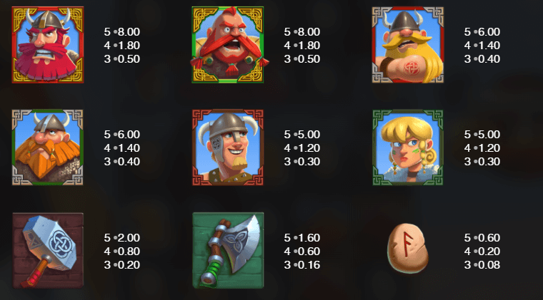 Szimbólumai a zöld, piros törzs 3-3 kiemelt viking hőse. Az arany pajzs a Wild/vad szimbólum. Ezek mellett található még kalapács, balta és három viking rúna.