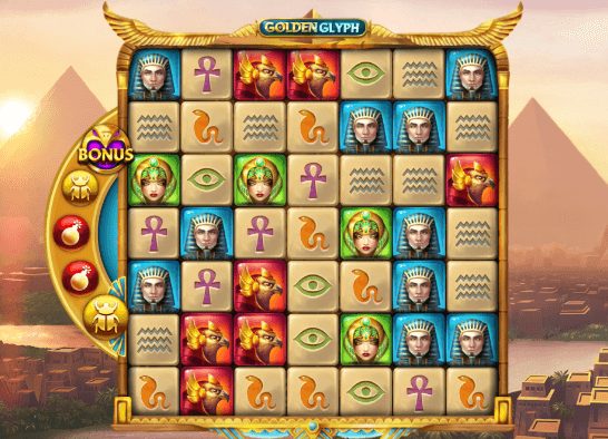 A Golden Glyph egy Cluster(Csomó) tÃpusú játékgép, amely nem a szabványos nyerÅ‘vonalakra fizet a tárcsán, hanem egy 7×7-es rácson a legalább 5 szimbólumból álló csomókra.
